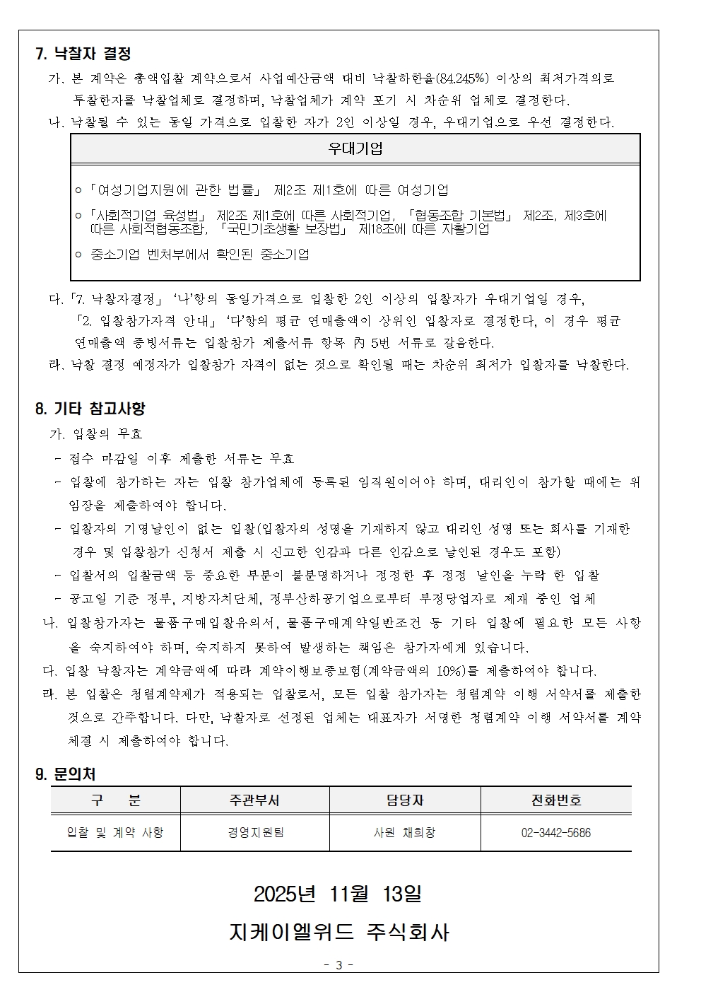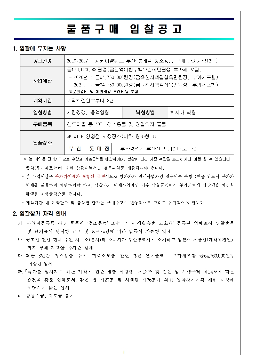 GKLWITH 회사소개 대표이사 인사말 설립 목적 비전 회사연혁 조직도 찾아오시는 길 사업소개 사업현황 정보공개 경영공시 입찰정보 열린마당 공지사항 홍보자료 채용공고 ESG경영 ESG종합추진계획 E(환경) S(사회) G(지배구조) 소통공간 복리후생/인사정보 생활법률서비스 생활세무서비스 신고센터 신고센터 LOGIN JOIN search 정보공개 정보공개 회사소개 사업소개 정보공개 열린마당 ESG경영 소통공간 신고센터 입찰정보 경영공시 입찰정보 입찰정보 채용공고 홍보자료 일반현황 경영비전 복리후생/인사정보 생활법률서비스 생활세무서비스 신고센터 안전보건관리규정 자료게시판 임직원수 임원현황 신규채용현황 및 유연근무현황 기관장 업무 추진비 복리후생비 노동조합관련현황 정관내부규정 일가정 양립 지원제도 운영현황 요약재무상태표 요약손익계산서 수입지출현황 주요사업 자본금 및 주주현황 납세정보현황 감사보고서 이사회 회의록 내부 감사결과 임직원 채용정보 E(환경) (G)지배구조 입찰정보 안전자료실 갤러리게시판 공지사항 1:1문의 리뷰 2026/2027년 지케이엘위드 부산 롯데점 청소용품 구매 단가계약(2년) 작성자 관리자 등록일 2025.11.13 조회수 20 첨부파일 1_ GKLWITH 부산 롯데점 청소용품 단가계약 입찰.zip 목록으로