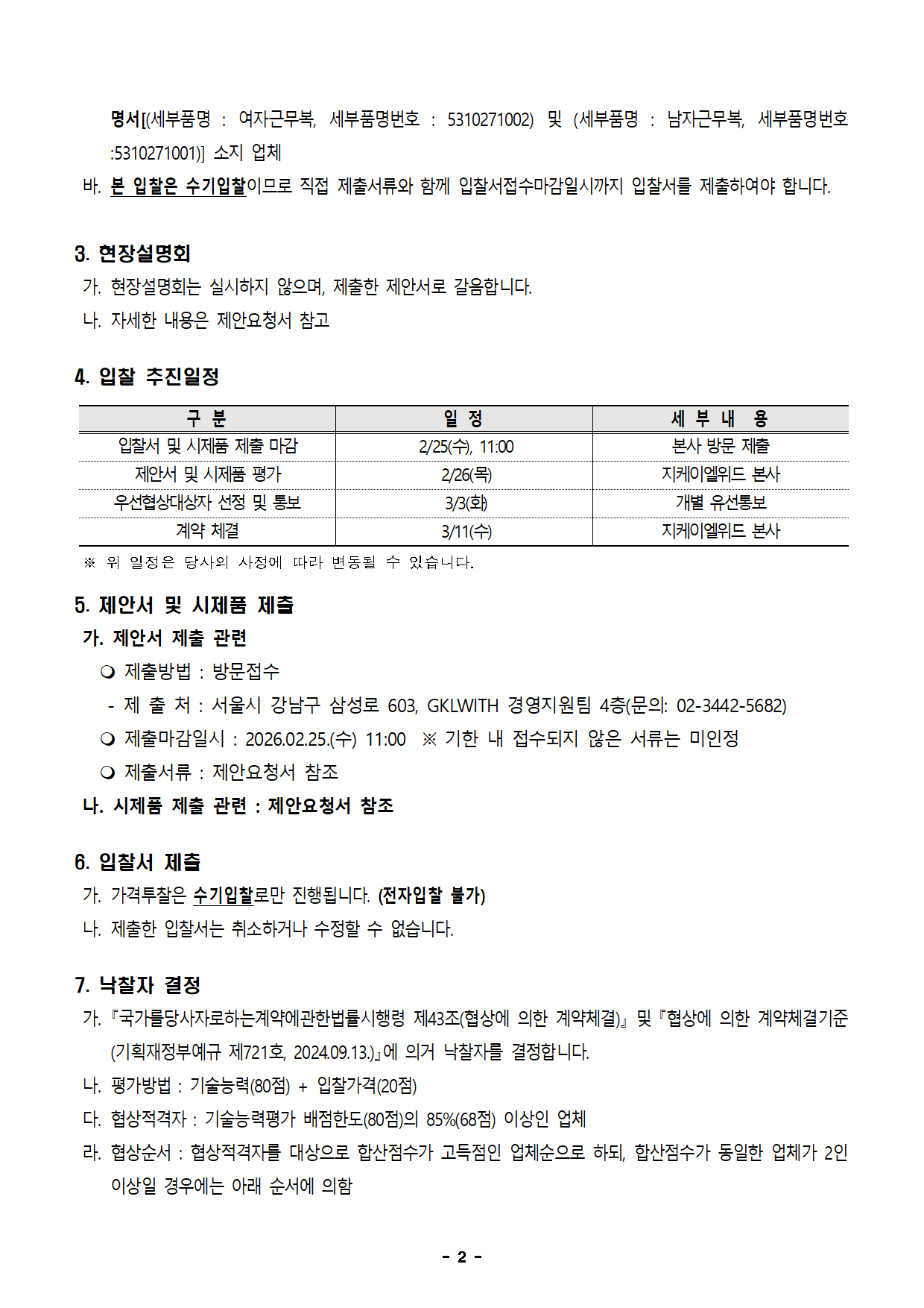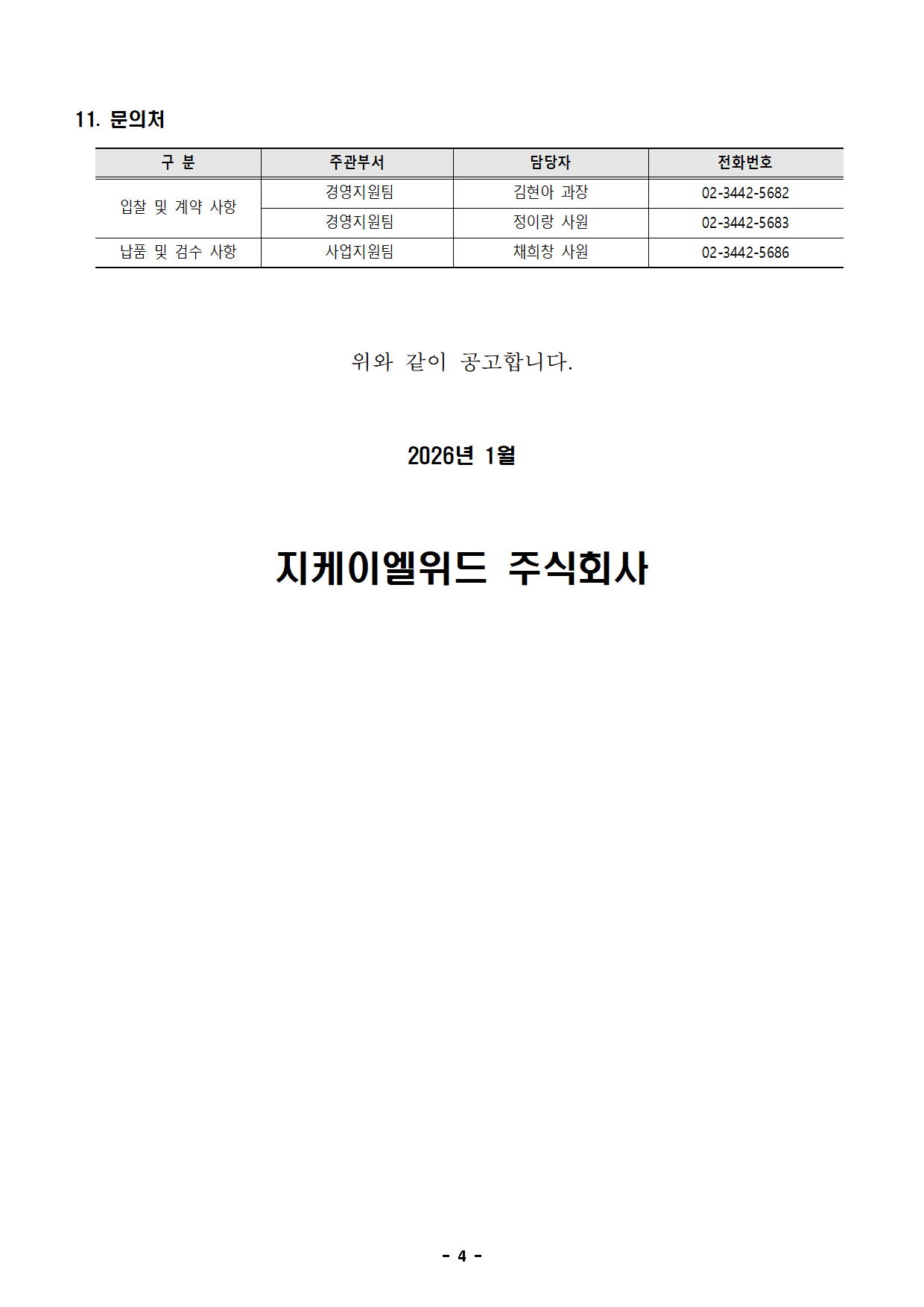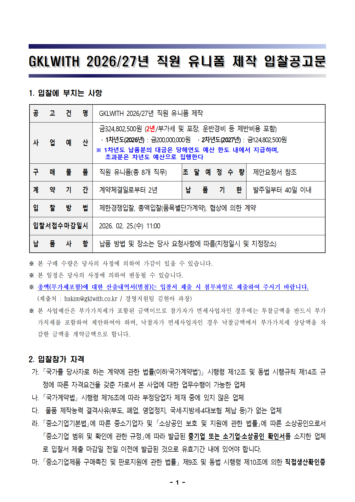 GKLWITH 회사소개 대표이사 인사말 설립 목적 비전 회사연혁 조직도 찾아오시는 길 사업소개 사업현황 정보공개 경영공시 입찰정보 열린마당 공지사항 홍보자료 채용공고 ESG경영 ESG종합추진계획 E(환경) S(사회) G(지배구조) 소통공간 복리후생/인사정보 생활법률서비스 생활세무서비스 신고센터 신고센터 LOGIN JOIN search 정보공개 정보공개 회사소개 사업소개 정보공개 열린마당 ESG경영 소통공간 신고센터 입찰정보 경영공시 입찰정보 입찰정보 채용공고 홍보자료 일반현황 경영비전 복리후생/인사정보 생활법률서비스 생활세무서비스 신고센터 안전보건관리규정 자료게시판 임직원수 임원현황 신규채용현황 및 유연근무현황 기관장 업무 추진비 복리후생비 노동조합관련현황 정관내부규정 일가정 양립 지원제도 운영현황 요약재무상태표 요약손익계산서 수입지출현황 주요사업 자본금 및 주주현황 납세정보현황 감사보고서 이사회 회의록 내부 감사결과 임직원 채용정보 E(환경) (G)지배구조 입찰정보 안전자료실 갤러리게시판 공지사항 1:1문의 리뷰 GKLWITH 2026/27년 직원 유니폼 제작 작성자 관리자 등록일 2026.01.26 조회수 7 첨부파일 입찰공고_2026_27년 직원 유니폼 입찰.zip 목록으로
