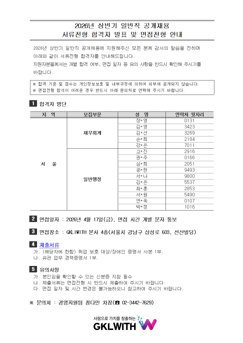 GKLWITH 회사소개 대표이사 인사말 설립 목적 비전 회사연혁 조직도 찾아오시는 길 사업소개 사업현황 정보공개 경영공시 입찰정보 열린마당 공지사항 홍보자료 채용공고 ESG경영 ESG종합추진계획 E(환경) S(사회) G(지배구조) 소통공간 복리후생/인사정보 생활법률서비스 생활세무서비스 신고센터 신고센터 LOGIN JOIN search 열린마당 GKLWITH의 새로운 소식을 가장 먼저 만나보세요 열린마당 회사소개 사업소개 정보공개 열린마당 ESG경영 소통공간 신고센터 채용공고 공지사항 홍보자료 채용공고 채용공고 채용공고 홍보자료 일반현황 경영비전 복리후생/인사정보 생활법률서비스 생활세무서비스 신고센터 안전보건관리규정 자료게시판 임직원수 임원현황 신규채용현황 및 유연근무현황 기관장 업무 추진비 복리후생비 노동조합관련현황 정관내부규정 일가정 양립 지원제도 운영현황 요약재무상태표 요약손익계산서 수입지출현황 주요사업 자본금 및 주주현황 납세정보현황 감사보고서 이사회 회의록 내부 감사결과 임직원 채용정보 E(환경) (G)지배구조 입찰정보 안전자료실 갤러리게시판 공지사항 1:1문의 리뷰 2026년 상반기 일반직 공개채용 서류전형 합격자 발표 및 면접전형 안내 작성자 관리자 등록일 2026.04.15 조회수 70 목록으로