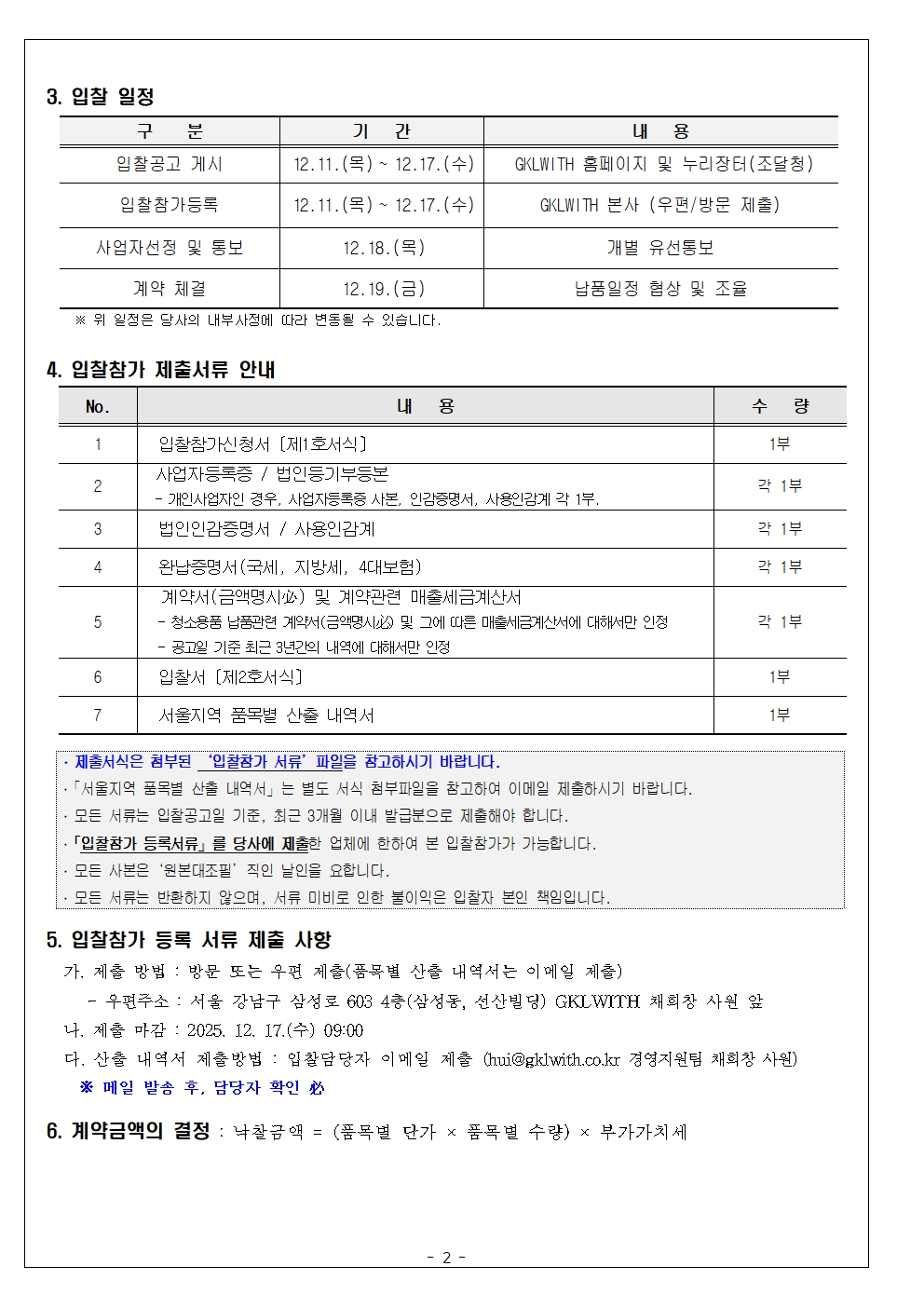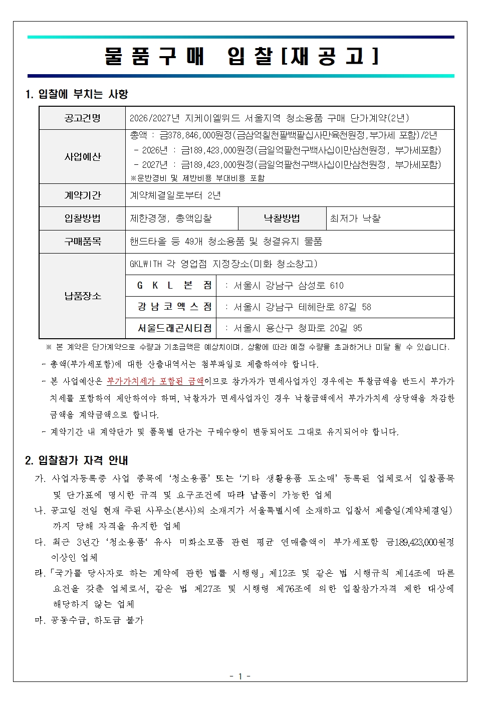 GKLWITH 회사소개 대표이사 인사말 설립 목적 비전 회사연혁 조직도 찾아오시는 길 사업소개 사업현황 정보공개 경영공시 입찰정보 열린마당 공지사항 홍보자료 채용공고 ESG경영 ESG종합추진계획 E(환경) S(사회) G(지배구조) 소통공간 복리후생/인사정보 생활법률서비스 생활세무서비스 신고센터 신고센터 LOGIN JOIN search 정보공개 정보공개 회사소개 사업소개 정보공개 열린마당 ESG경영 소통공간 신고센터 입찰정보 경영공시 입찰정보 입찰정보 채용공고 홍보자료 일반현황 경영비전 복리후생/인사정보 생활법률서비스 생활세무서비스 신고센터 안전보건관리규정 자료게시판 임직원수 임원현황 신규채용현황 및 유연근무현황 기관장 업무 추진비 복리후생비 노동조합관련현황 정관내부규정 일가정 양립 지원제도 운영현황 요약재무상태표 요약손익계산서 수입지출현황 주요사업 자본금 및 주주현황 납세정보현황 감사보고서 이사회 회의록 내부 감사결과 임직원 채용정보 E(환경) (G)지배구조 입찰정보 안전자료실 갤러리게시판 공지사항 1:1문의 리뷰 2026/2027년 지케이엘위드 서울지역 청소용품 구매 단가계약(2년) 재입찰 작성자 관리자 등록일 2025.12.11 조회수 4 첨부파일 2_ GKLWITH 서울지역 청소용품 구매 단가계약 재입찰.zip 목록으로
