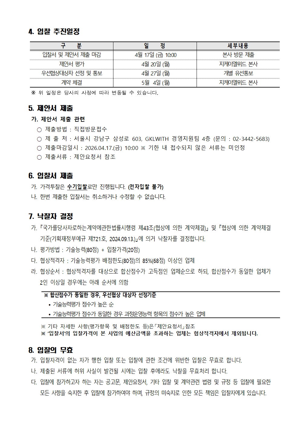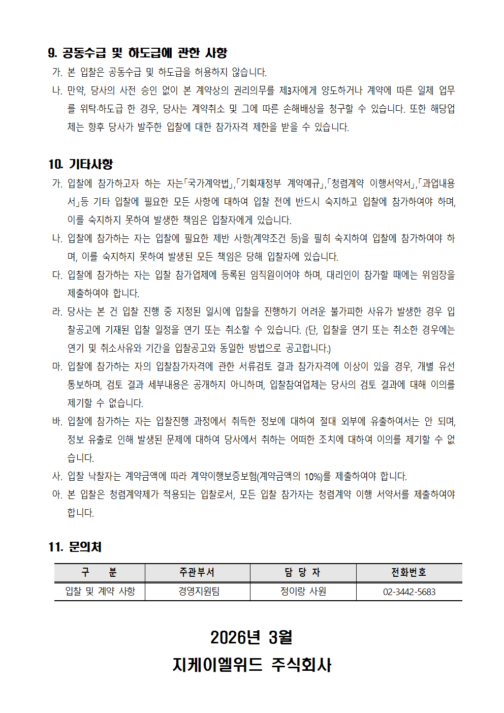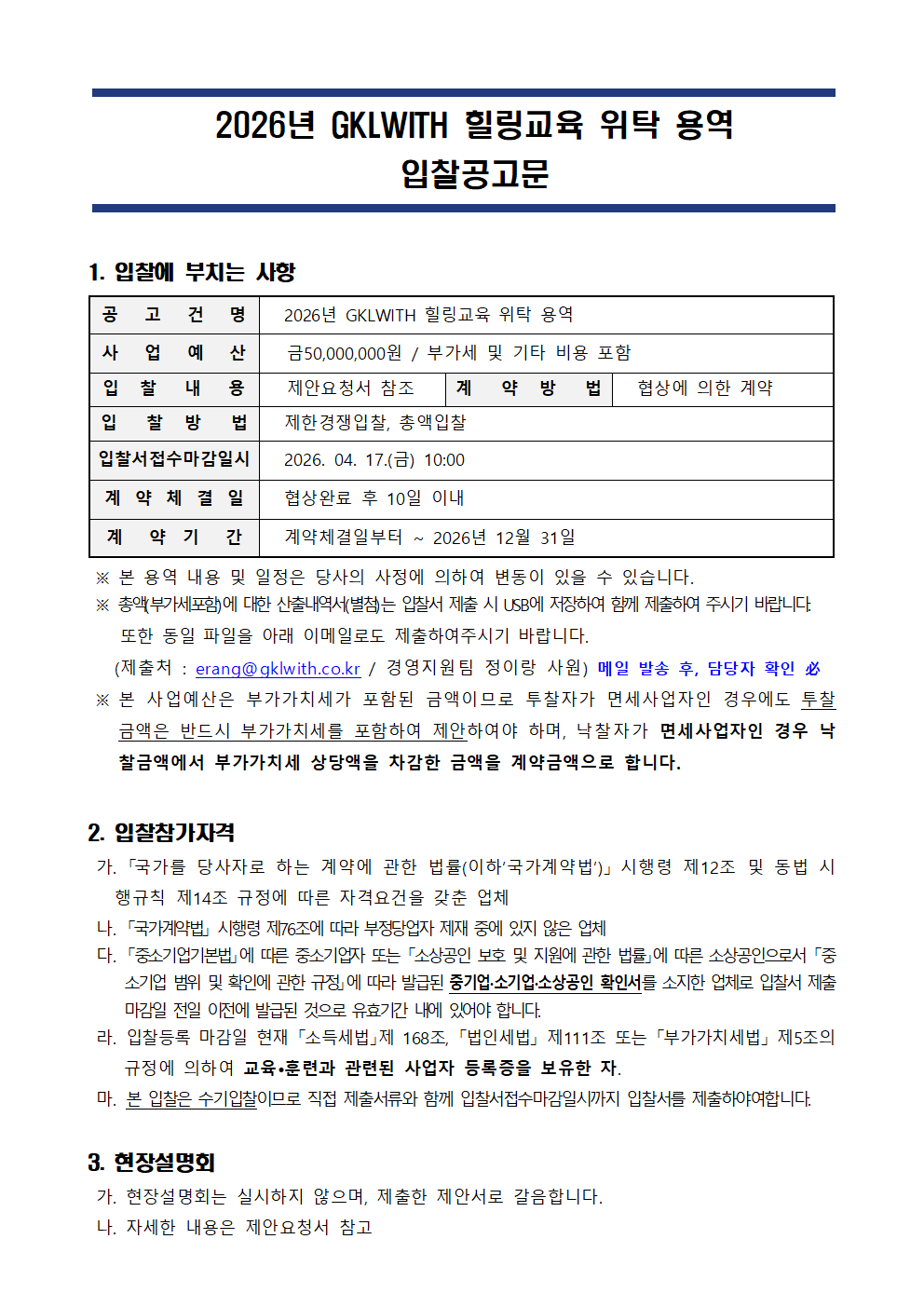 GKLWITH 회사소개 대표이사 인사말 설립 목적 비전 회사연혁 조직도 찾아오시는 길 사업소개 사업현황 정보공개 경영공시 입찰정보 열린마당 공지사항 홍보자료 채용공고 ESG경영 ESG종합추진계획 E(환경) S(사회) G(지배구조) 소통공간 복리후생/인사정보 생활법률서비스 생활세무서비스 신고센터 신고센터 LOGIN JOIN search 정보공개 정보공개 회사소개 사업소개 정보공개 열린마당 ESG경영 소통공간 신고센터 입찰정보 경영공시 입찰정보 입찰정보 채용공고 홍보자료 일반현황 경영비전 복리후생/인사정보 생활법률서비스 생활세무서비스 신고센터 안전보건관리규정 자료게시판 임직원수 임원현황 신규채용현황 및 유연근무현황 기관장 업무 추진비 복리후생비 노동조합관련현황 정관내부규정 일가정 양립 지원제도 운영현황 요약재무상태표 요약손익계산서 수입지출현황 주요사업 자본금 및 주주현황 납세정보현황 감사보고서 이사회 회의록 내부 감사결과 임직원 채용정보 E(환경) (G)지배구조 입찰정보 안전자료실 갤러리게시판 공지사항 1:1문의 리뷰 2026년 GKLWITH 힐링교육 위탁업체 용역 입찰 공고 작성자 관리자 등록일 2026.03.16 조회수 36 첨부파일 2026년 GKLWITH 힐링교육 입찰 공고.zip 목록으로